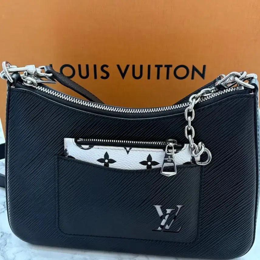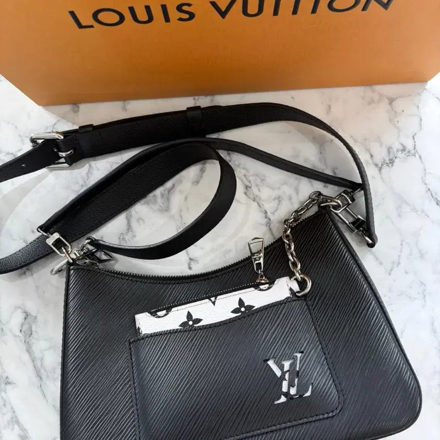 For sale: a Louis Vuitton Marelle bag. It features a black color and includes a card wallet as a stylish accent. Please proceed with secure payment if you have no further questions.