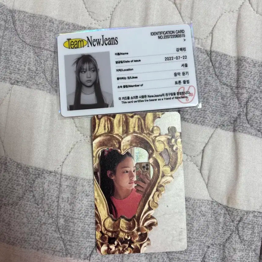 뉴진스 해린 학생증이랑 포토카드 같이 판매합니다. 학생증에는 해린이 이름, 생일, 좋아하는 것들이 적혀있습니다. 포카 뒷면 하자 없고, 보관도 잘 되어있습니다. 문의 없으시면 바로 안전결제해주시면 됩니다!