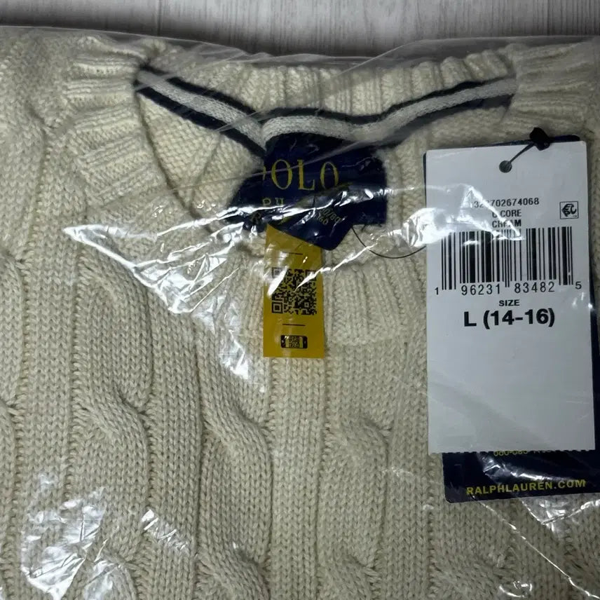 This is a brand new Polo Boys Cable Knit in ivory and size L, perfect for women. It's brand new, unopened, so grab it now.