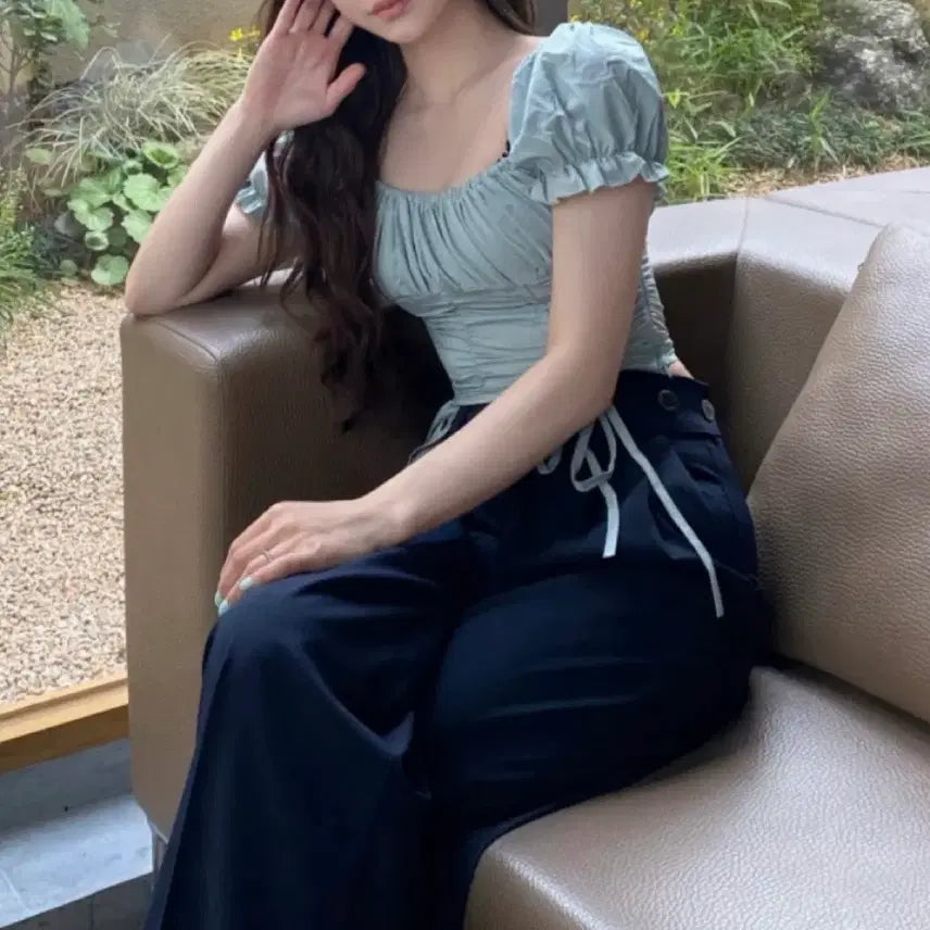 [BUNJANG] Mint Puff Sleeve Ruffled Blouse / 민트 퍼프 셔링 블라우스