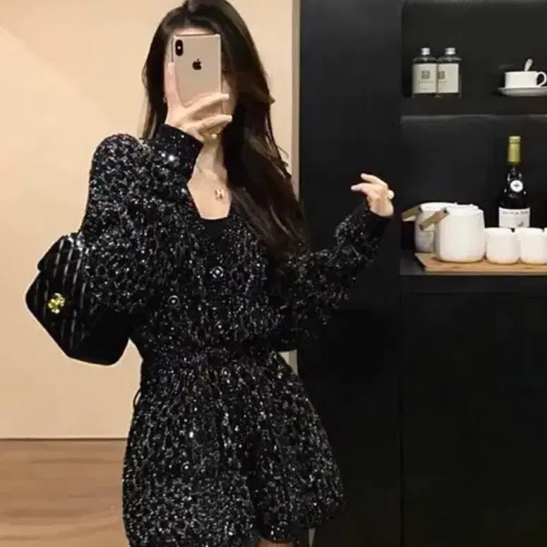 [BUNJANG] Black Tweed Pearl Belted Cardigan / 수입의류 블랙 트위드 펄 벨트 가디건