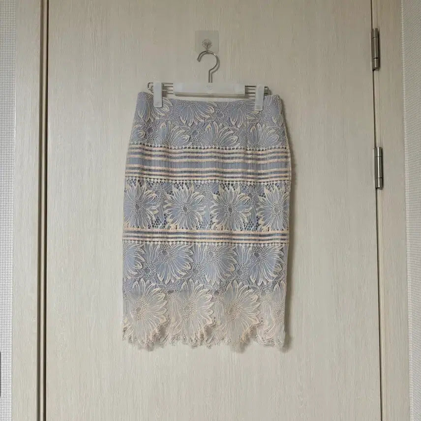 [BUNJANG] Reine Sky Blue & Beige Two-Tone Floral Embroidered Lace Skirt - M / 렌느 reine 스카이블루+베이지 투톤 플라워 자수 레이스 스커트 M