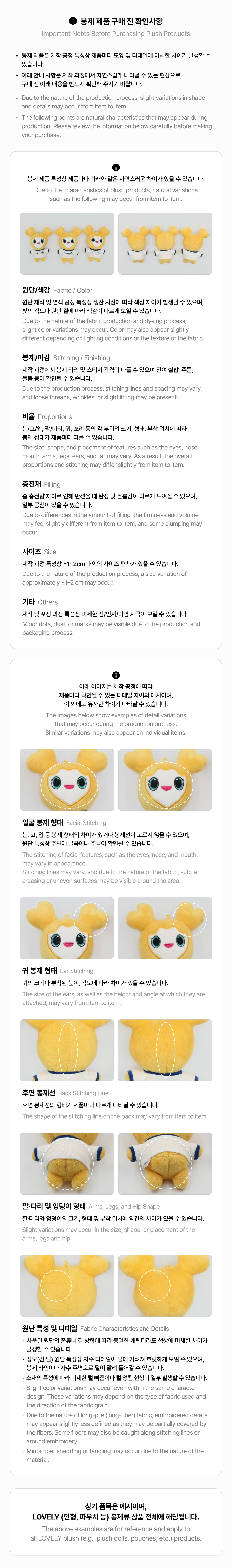 - In the case of plush (sewn) products, facial shapes may vary slightly, and some finishing may not be perfectly neat due to product characteristics.