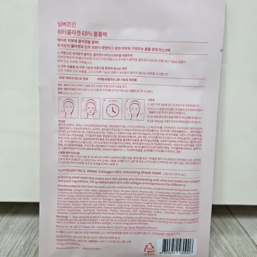 [BUNJANG] 넘버즈인 2번 워터 콜라겐 65% 볼륨 마스크팩 / 넘버즈인2번 워터 콜라겐 65% 볼륨 마스크팩