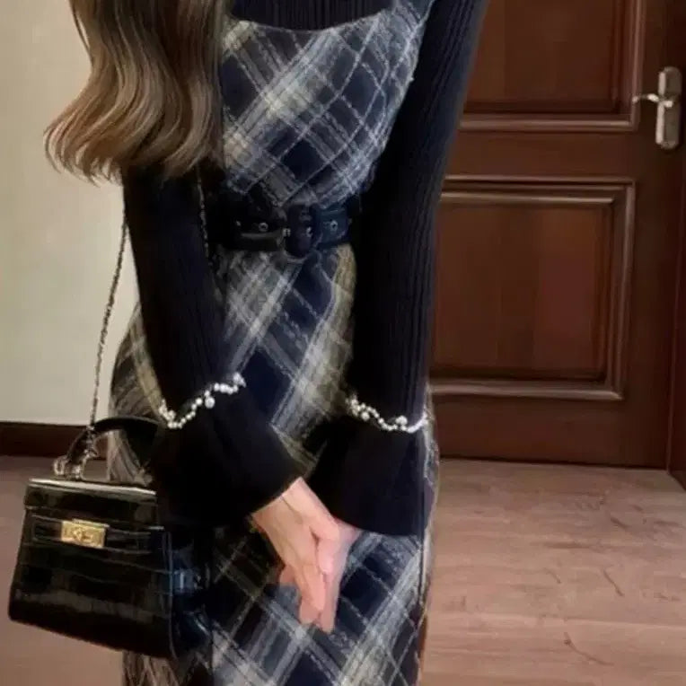 [BUNJANG] Two-Piece Set: Gold Collar Knit Top & Check Slit Skirt / 골드카라 환편 니트+체크 반밴딩 앞트임 스커트 투피스 세트