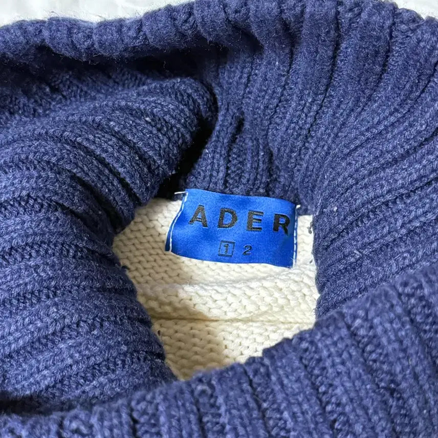 아이보리색 아더에러 터틀넥 니트입니다. 네이비 색상으로 포인트가 들어가있는 디자인입니다. 아더에러 초창기 유물같은 옷으로 매우 희귀한 매물입니다.