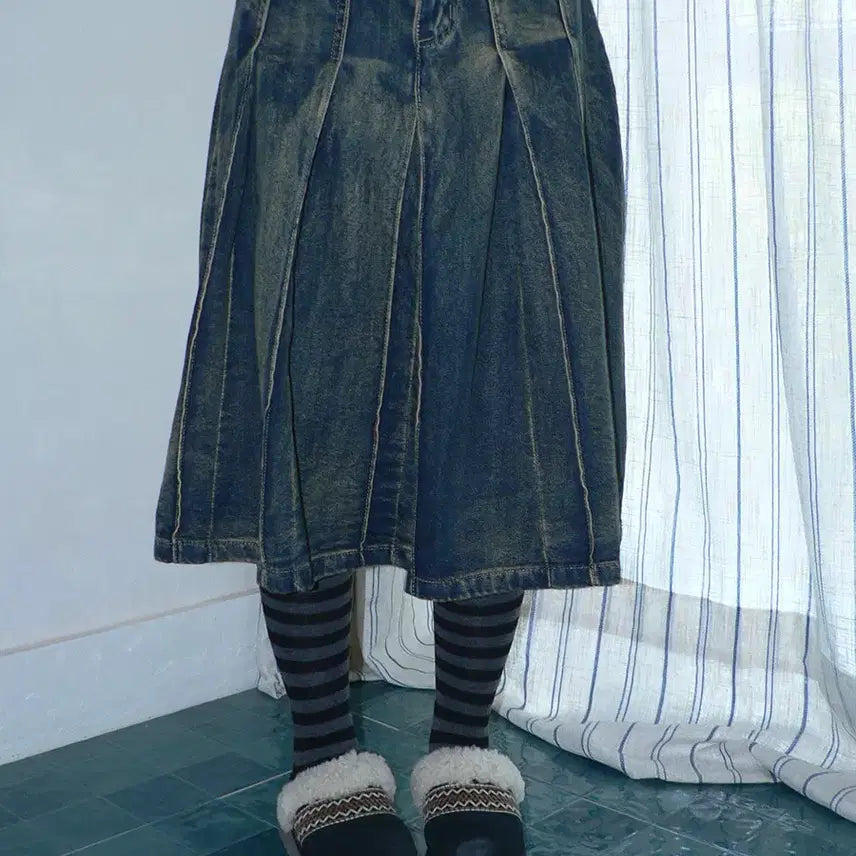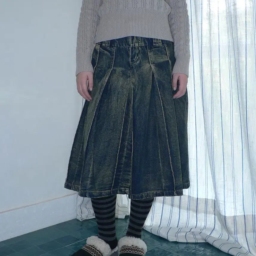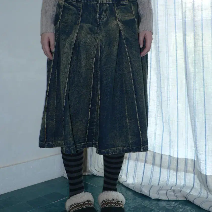 [BUNJANG] angproject Distressed A-Line Denim Pleated Skirt / angproject 레트로 디스트레스드 A라인 데님 플리츠 치마