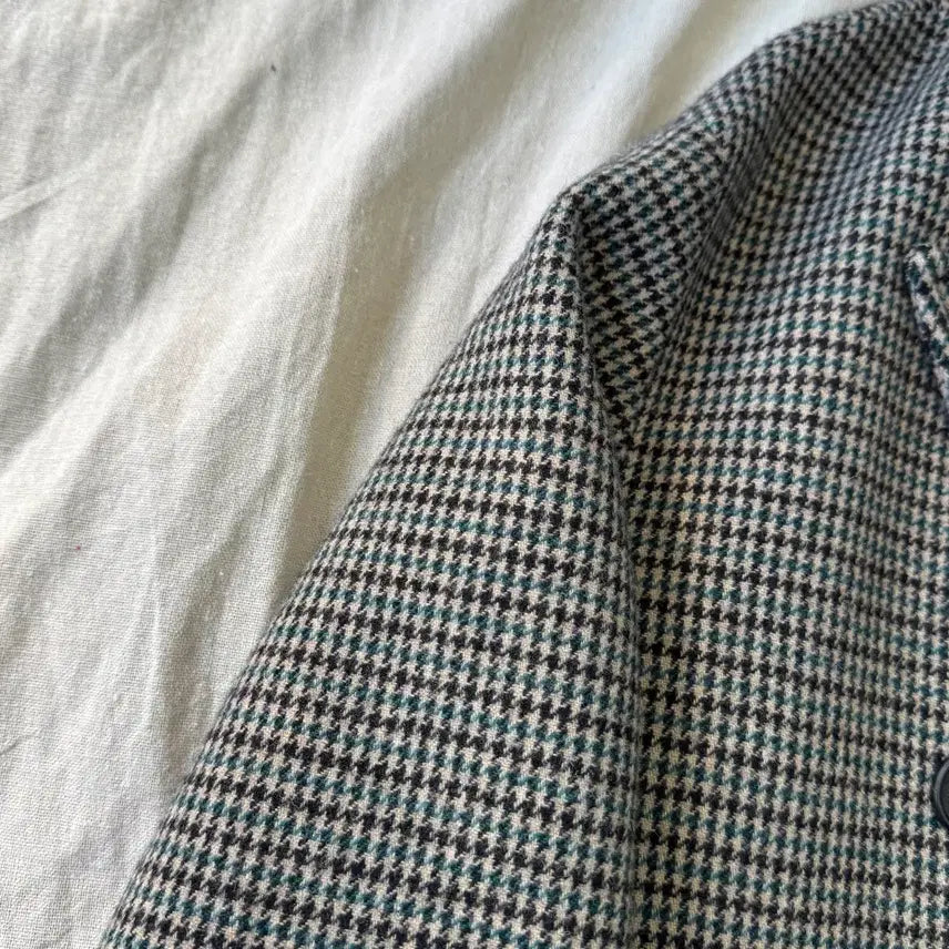This Attention Row double-breasted coat features a sophisticated green check pattern. Constructed from high-quality, durable wool, this coat offers a structured silhouette. The color combination is premium, offering a luxurious aesthetic. The coat features a long length, a sought-after style that is becoming increasingly rare. Originally priced over ₩400,000, this piece reflects superior quality.