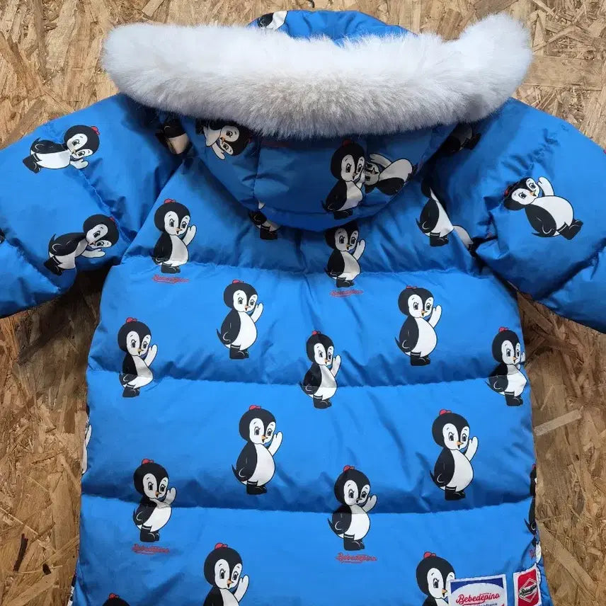 This is a Bebedpino Penguin Down Padded Jumper in size 100. The blue color and adorable penguin pattern are perfect for layering. The fur hood keeps you warm even in the dead of winter. If you have any questions, please proceed with secure payment immediately!