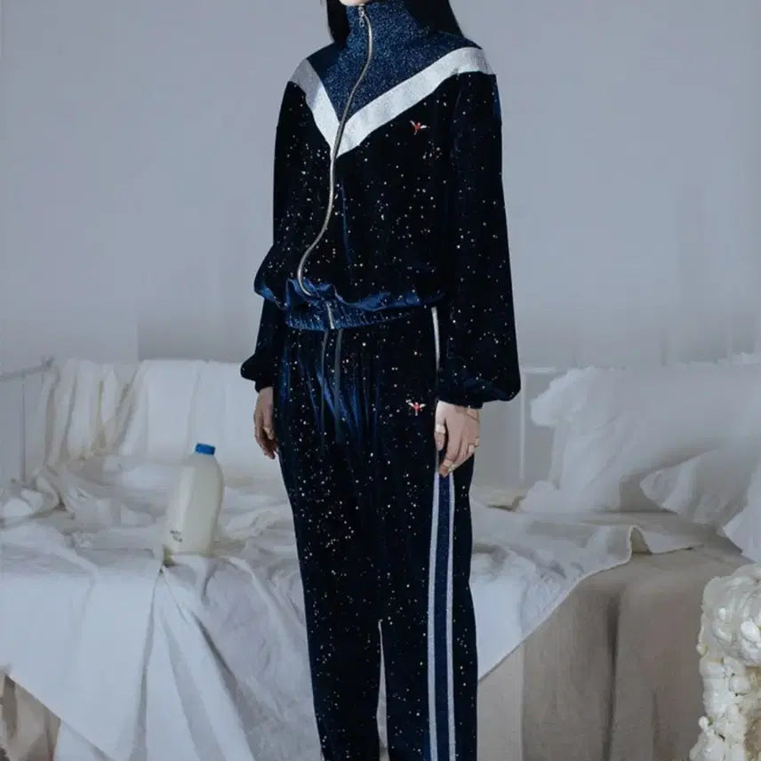 This CLOT Studio training suit set features a vibrant navy color. The white line detailing adds a slimming effect.