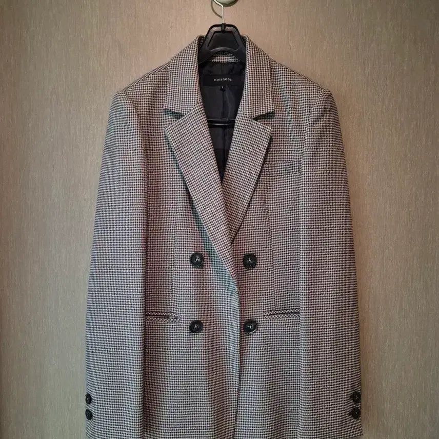 This is a COLLINCOS houndstooth pattern double-breasted jacket. It's a timeless design, making it a great addition to your collection. The condition is the same as in the photos, and it's been worn sparingly, so it's in pristine condition. The buttons are designer, and there are internal fastening loops.
