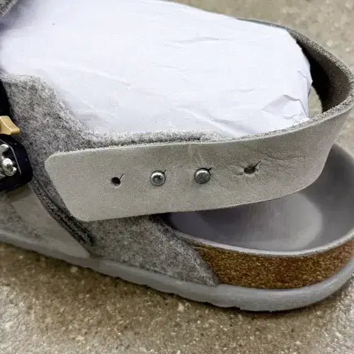 발등과 뒤꿈치 부분에는 부드러운 누벅 카프스킨 스트랩이 사용되었습니다.
