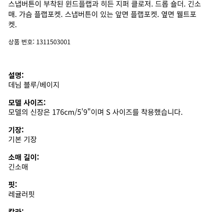 H&M 데님 사파리 자켓입니다. 코듀로이 카라 포인트가 있어서 더욱 스타일리쉬하게 연출 가능합니다. 데님 소재로 제작되어 편안하게 착용할 수 있습니다.