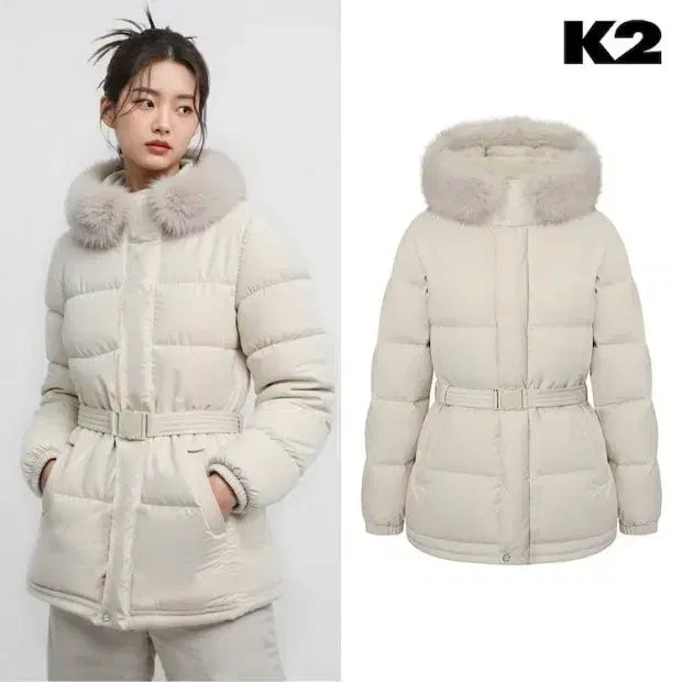 The K2 K95 bagel goose down jacket in oatmeal, as worn by Suzy and Lee Seo. Featuring a waist belt to accentuate the silhouette and luxurious European Saga fox fur trim.