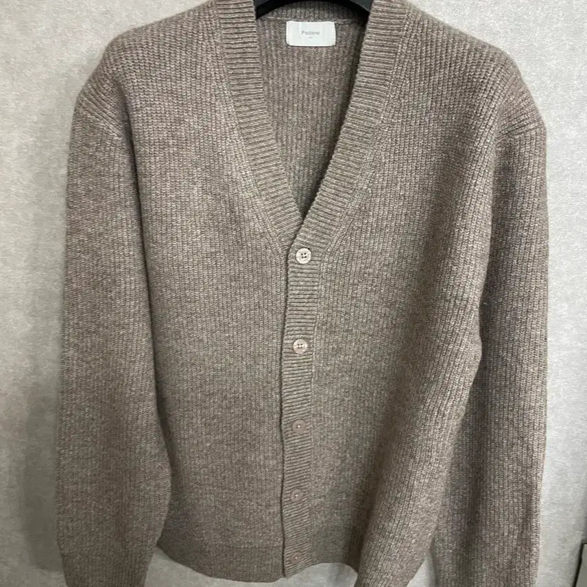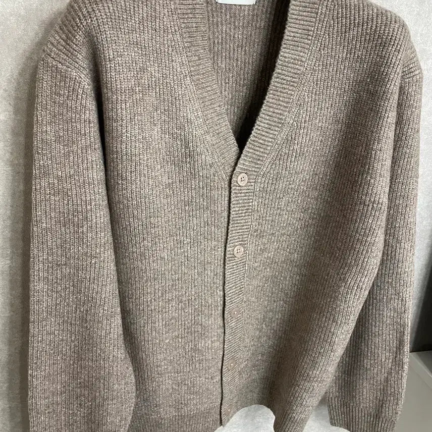 This is a new deep beige men's cardigan. The tight weave adds a touch of luxury. It pairs well with a variety of styles, from casual to formal. The fabric is excellent.