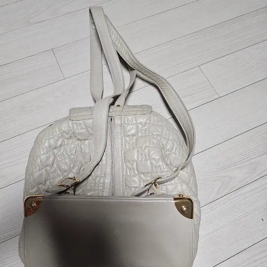 아이보리색 메트로시티 퀼팅 백팩입니다. 덮개 부분 금장 로고 장식이 고급스러움을 더합니다. 넉넉한 수납 공간으로 실용성까지 갖춘 가방입니다. 문의 없으시면 바로 안전결제해주시면 됩니다!