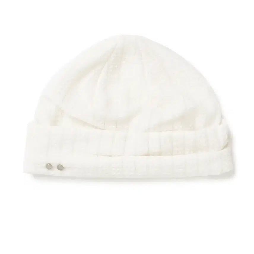 The Millo lace beanie features a unique weave, offering a distinct design element. The beanie showcases the Millo symbol logo patch. This item is ready for immediate purchase.