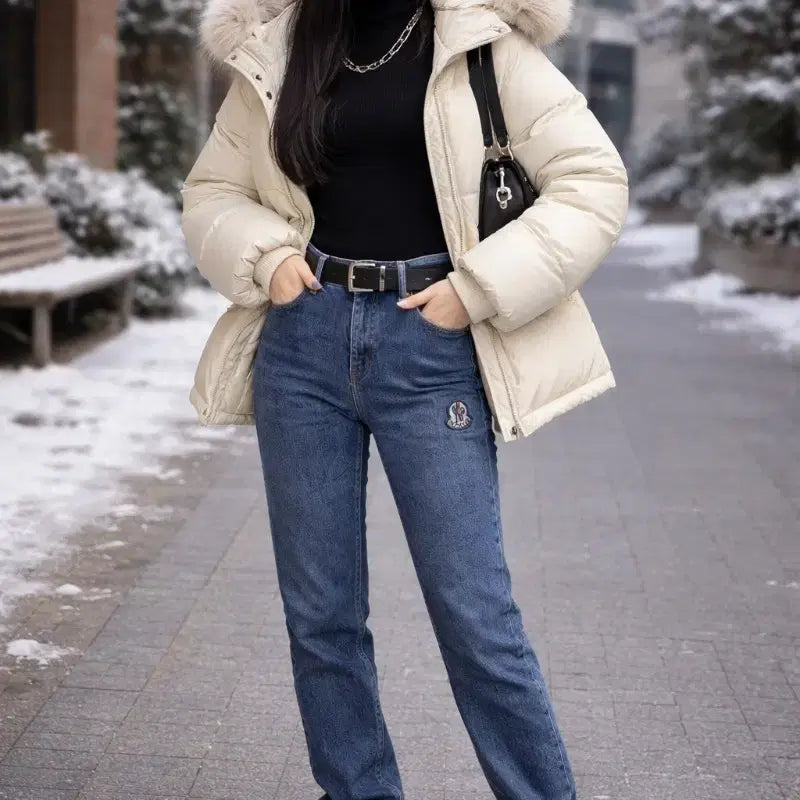 예쁜 패치 기모 청바지 중청색