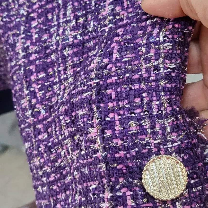폴앤조 트위드 자켓 퍼플색상입니다. 독특한 짜임과 색감이 돋보이는 제품입니다. 금장 단추로 포인트를 주어 고급스러움을 더했습니다. 문의 없으시면 바로 안전결제해주시면 됩니다! 은은한 빤짝이가 되어있습니다 66~77사이즈