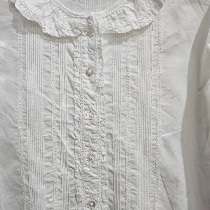 넥라인 프릴 디테일, 세로 핀턱과 레이스 장식, 자개 버튼 포인트까지