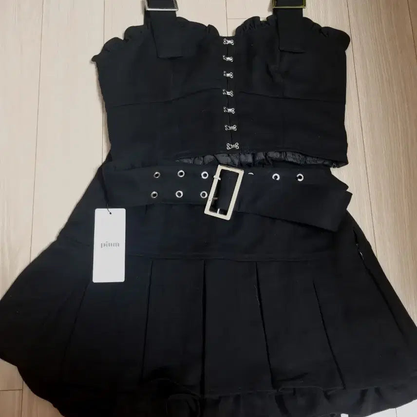 (프런트 훅 비스체x플리츠 스커트 세트 블랙)