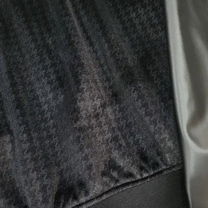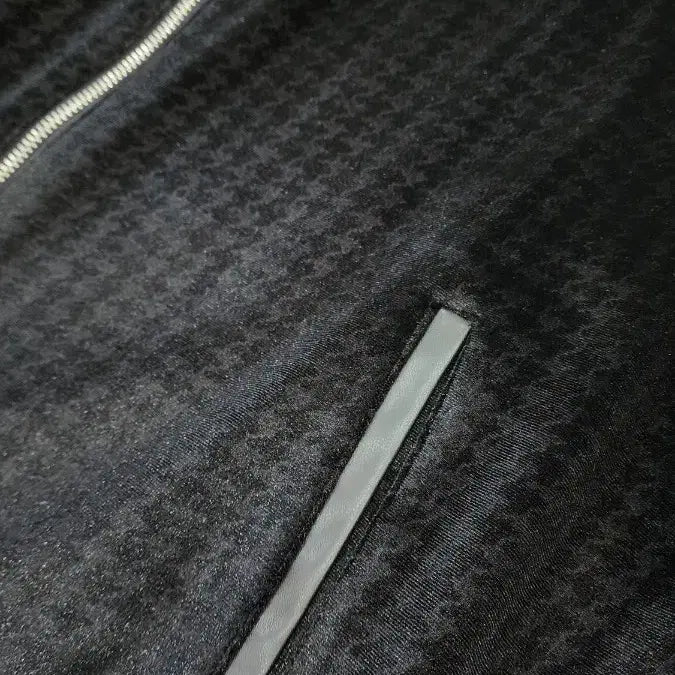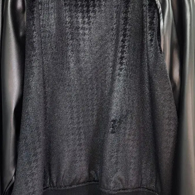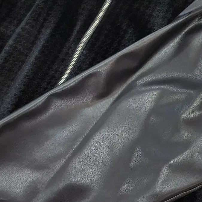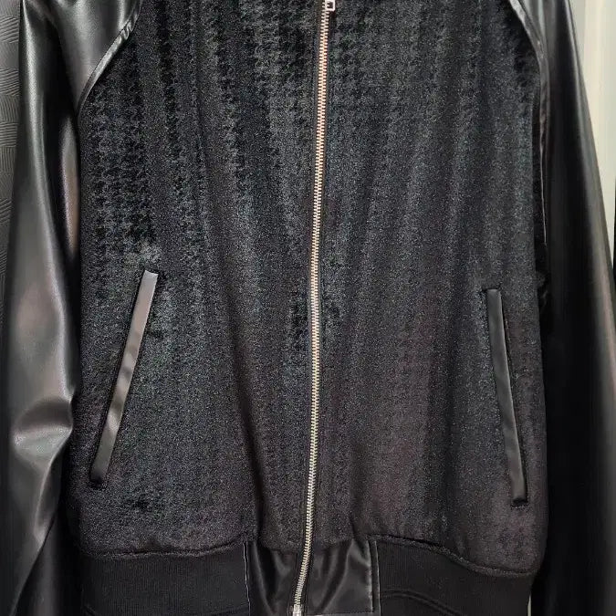 독특한 패턴과 가죽 소매 디테일이 돋보이는 스타일리시한 디자인입니다.