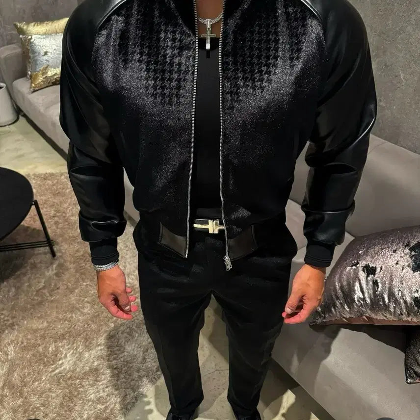 The Rapinato Etoile Leather Blouson Velvet Jacket in Black. Size 52. This stylish design features a unique pattern and leather sleeve detailing.