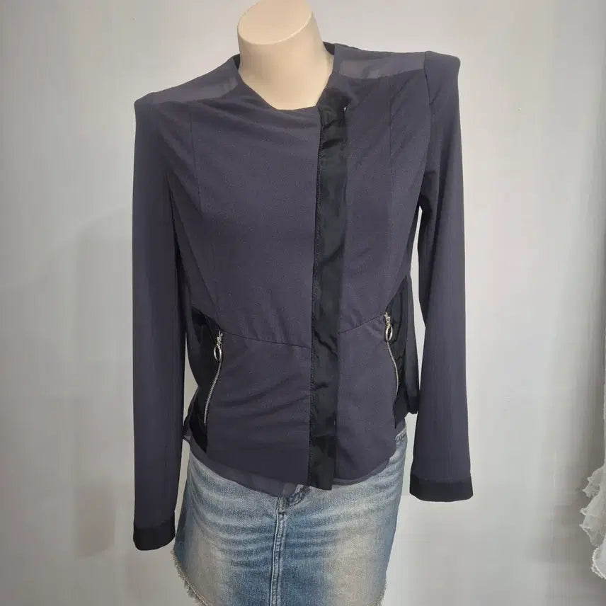 This is a slim-fit She's Miss jacket in charcoal. The unique navy color scheme is a highlight. The zipper detail on both pockets and the added detailing create a beautiful fit.