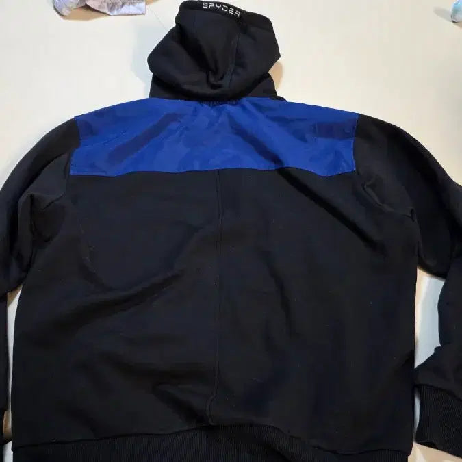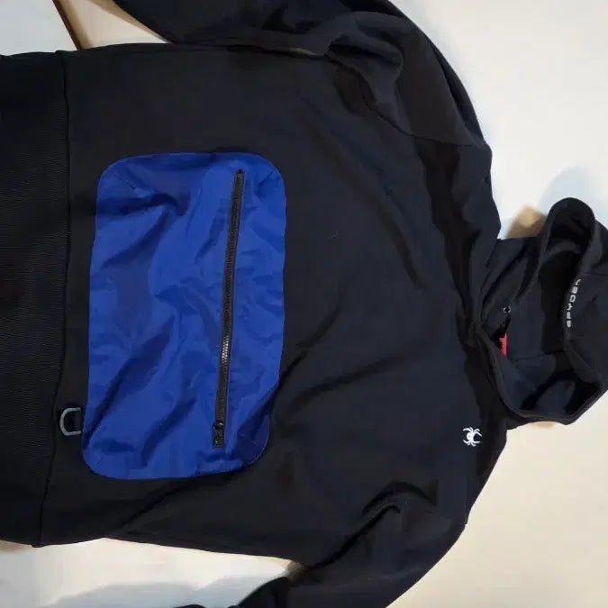 Black Spider hoodie featuring a blue pocket on the front. Size 105. The drawstring is missing. Otherwise, in great condition.