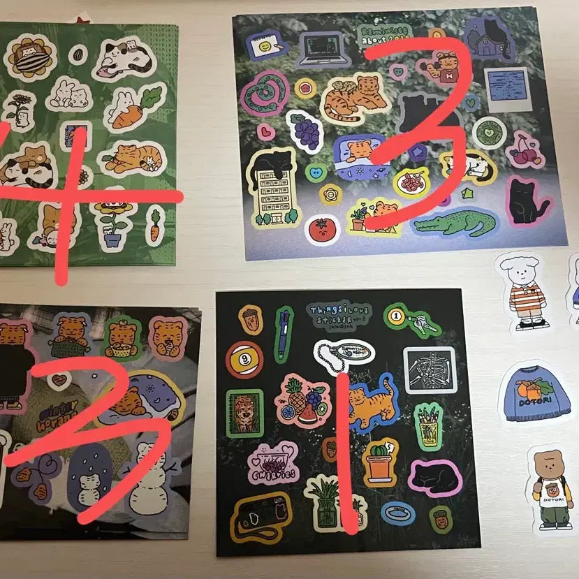 첫번째 스티커, 조각스티커 제외 나머지 3 종류는 잘라놓은 것도 있어서 같이 드릴게요 특전 엽서 2장도 포함