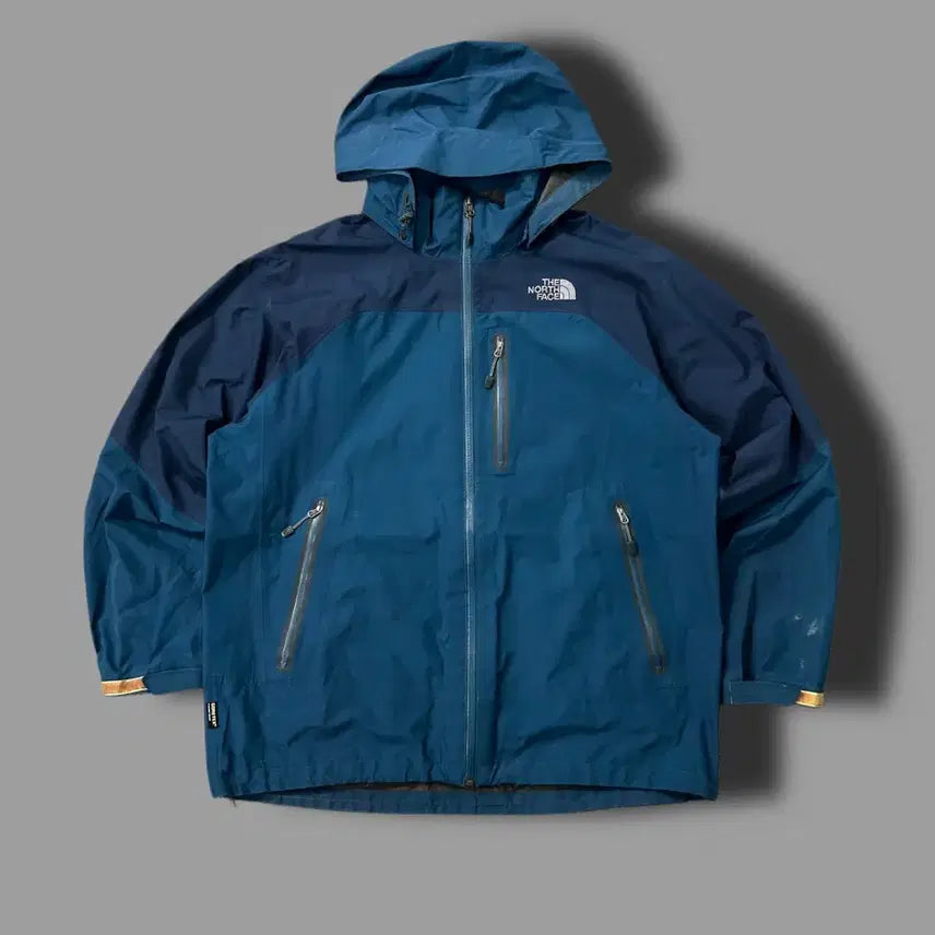 The North Face blue Gore-Tex windbreaker jacket. Features a striking color scheme. Constructed with durable Gore-Tex material. Minor discoloration on the sleeves, otherwise in good condition.
