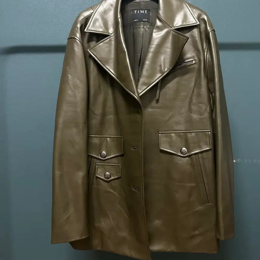 타임 가죽 자켓 짙은 올리브 색상입니다.
