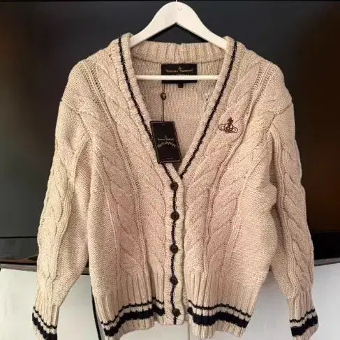 택 달린 비비안웨스트우드 케이블 니트 가디건입니다. 아이보리 색상에 네이비 라인 포인트가 들어가 있습니다. 케이블 짜임이 고급스럽고 예뻐요. 별도 문의 없으시면 바로 안전결제 부탁드려요!