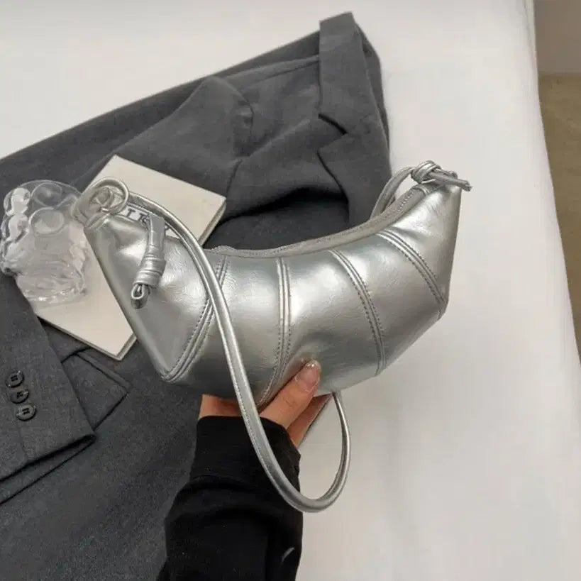 This is a new product. It's a silver hobo crossbody bag. This crescent-shaped shoulder bag is mini-sized for carrying small items. Its unique design makes it a great accent piece. If you have any questions, please proceed with secure payment immediately!