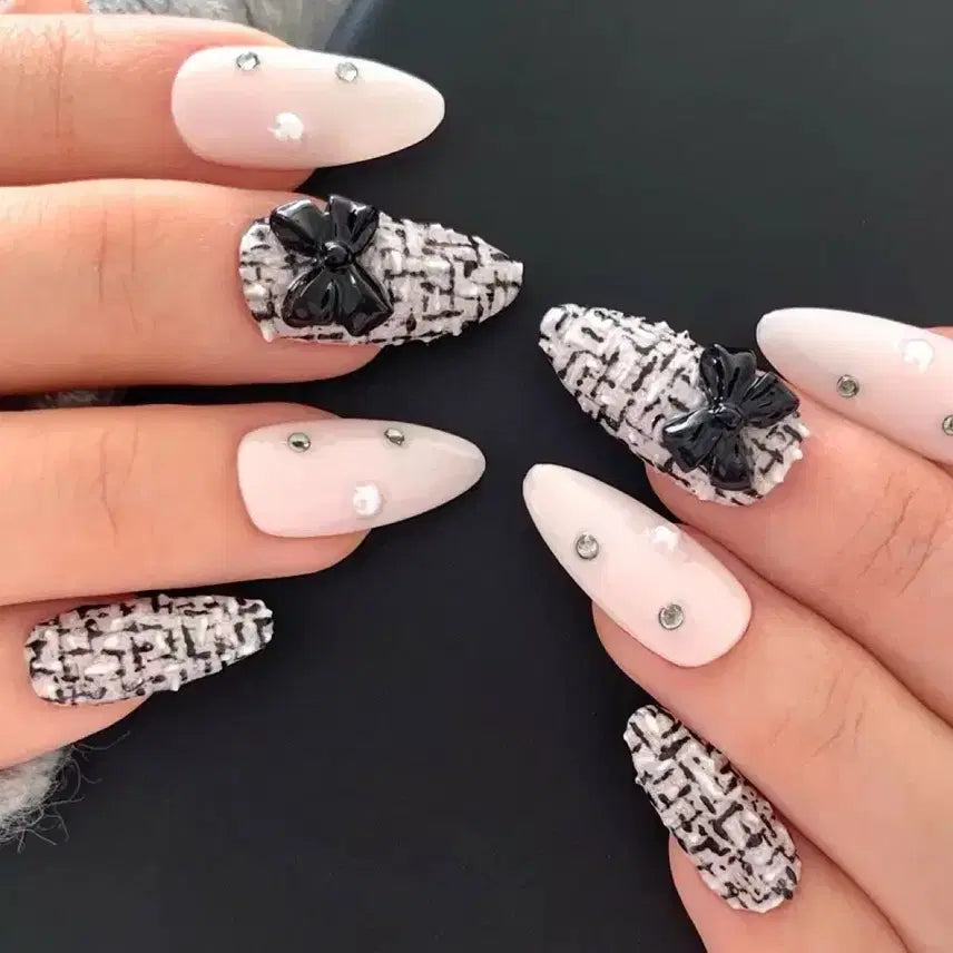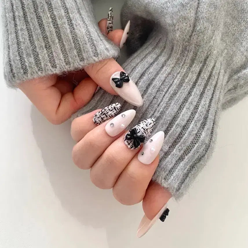 [BUNJANG] Sharon Blanc Black Ribbon Chain Tweed Nail Tip (14 Shapes) / *할인가* 블랙 리본 체인 트위드 네일팁 / 14종 쉐입