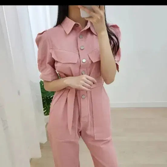 [BUNJANG] Pink Jumpsuit with Belt / 핑크 컬러 셔츠 점프수트 벨트 세트 새거