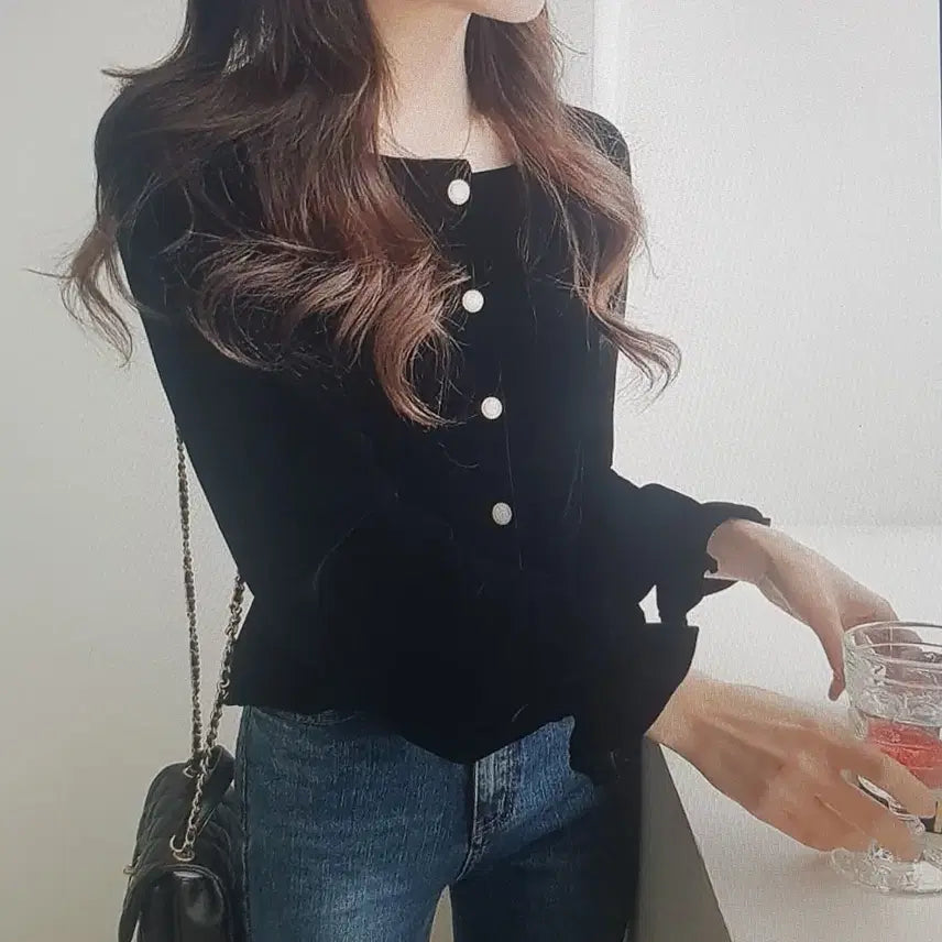 [BUNJANG] Black Velvet Gold Button Blouse / 블랙 벨벳 금장 버튼 블라우스