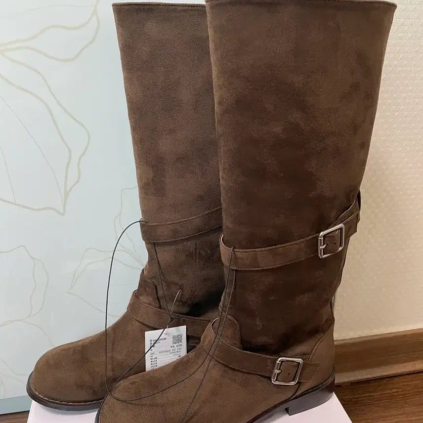 New, unworn 8 Seconds faux suede buckle long boots in brown. Originally priced at 89,900 KRW. The tag is attached but has a minor tear on the corner. These boots are currently sold out and hard to find.