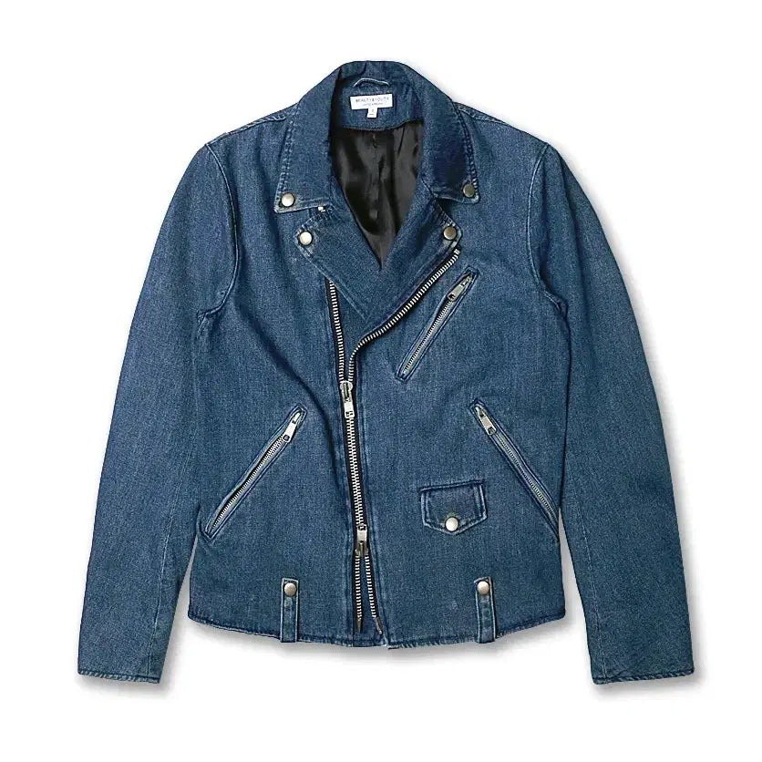 매력적인 컬러감의 데님으로 제작된 뷰티 앤 유스의 라이더 자켓입니다
