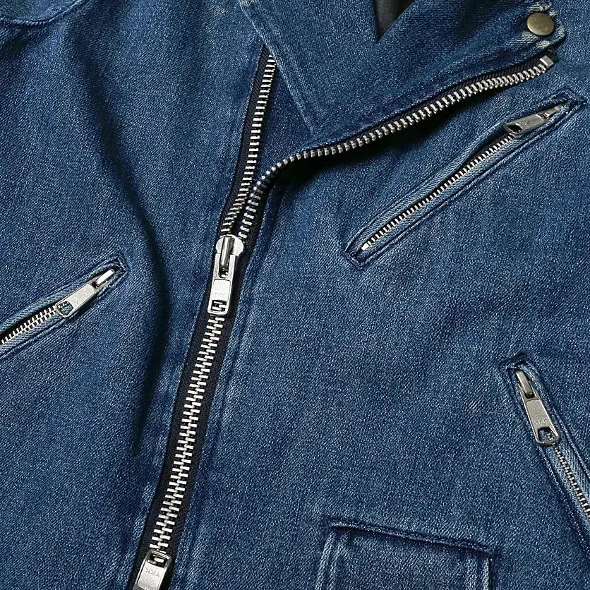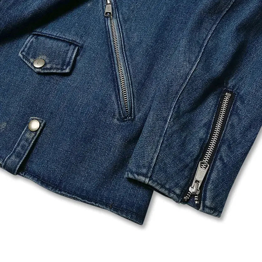 This jacket is made with denim in an appealing color. Features a two-way YKK zipper and a lined interior, offering a unique appeal compared to leather. Its versatile design makes it suitable for women as well.