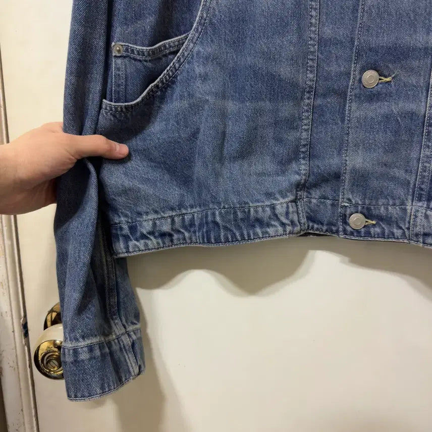 COS 오가닉 데님 자켓입니다. 넉넉한 포켓이 있어 수납이 용이합니다. 데님 특성상 자연스러운 워싱이 있습니다.