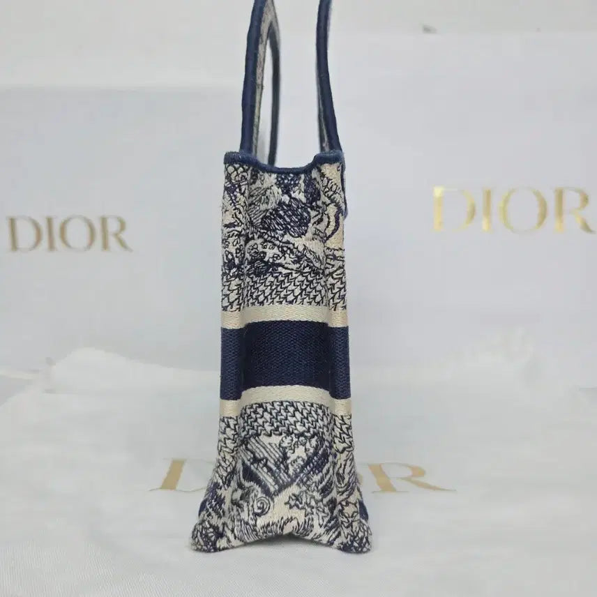 This is a Dior Book Tote Bag in a small size. The navy embroidered pattern adds a touch of luxury.