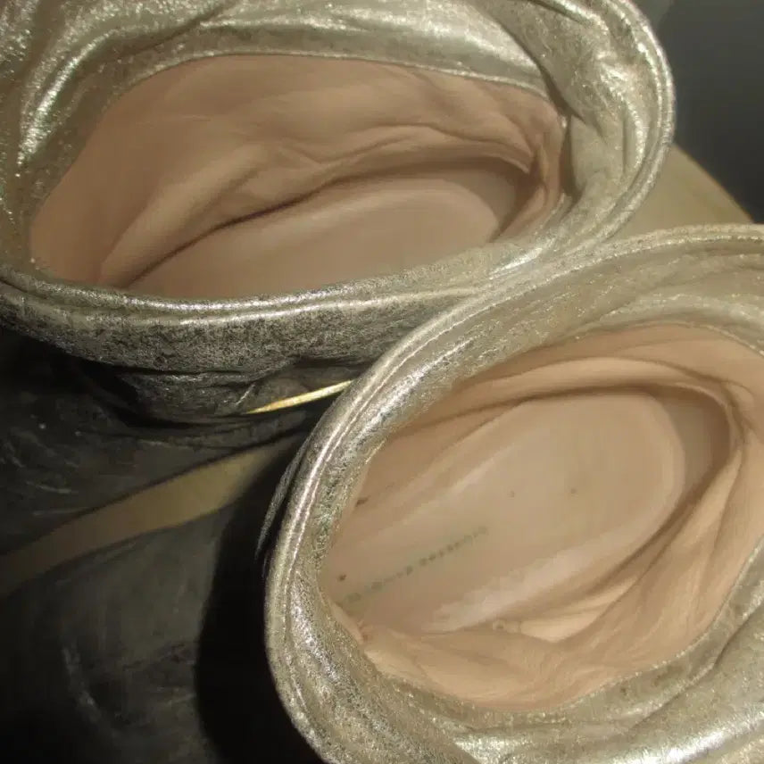 쥬세페자노티 메탈릭 골드 숏 부츠입니다. 골드에 실버 한스푼 넣은 색상에 버클 디테일까지 더해져 세련된 느낌을 줍니다. 진짜 개멋있습니다. 옷을 잘 아시는 분들은 알아보실거에요...