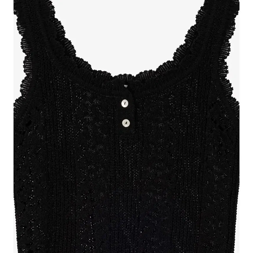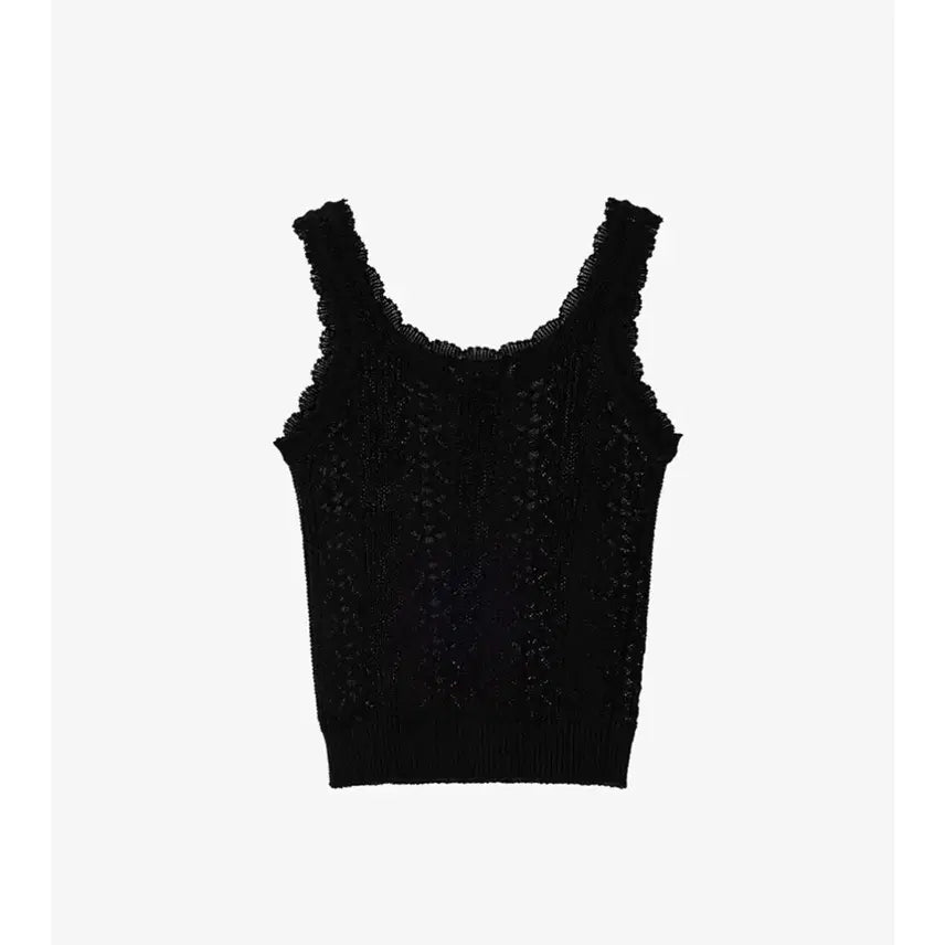 This knit sleeveless top features a cute perforation and lace design. While the perforation isn't overpowering on its own, the neckline is beautiful even when worn with a shirt or cardigan. It's also versatile enough to layer with a T-shirt or shirt in spring or fall.