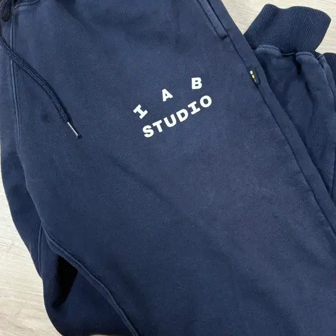아이앱 스튜디오 네이비 색상 조거 팬츠입니다. IAB STUDIO 로고가 흰색으로 프린트되어 있습니다. 트레이닝복으로 편하게 입기 좋습니다. 별도 문의 없으시면 바로 안전결제 부탁드려요!