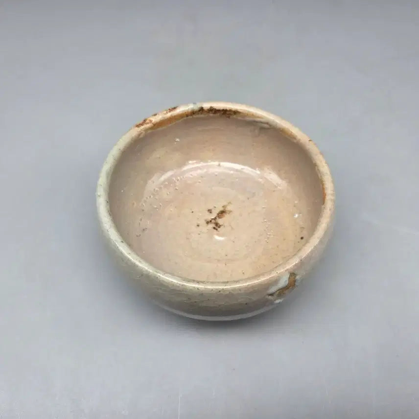 An antique white porcelain bowl from the late Joseon Dynasty, produced near Gyeongsangdo. The firing process resulted in a delicate 'Bipa-saek' (loquat color), a characteristic highly valued in tea bowls and cups for its antique aesthetic. The glaze on the body exhibits a distinctive 'Ilja-mun' (one-character mark), adding to its charm. Similar marks can be found on the Japanese National Treasure, the 'Kizaemon' tea bowl, which are highly prized. The bowl features a deep, inward-curving foot and well-defined plum blossom patterns. It is ideal for enjoying tea. Dimensions: 9.5cm diameter (mouth), 5.8cm height. Condition: The glaze is completely intact with fine crackling, but without any chips.