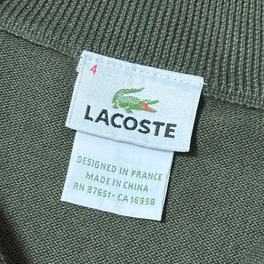 This is a cotton half-zip knit in olive color, size 4, from Lacoste, a premium French casual brand famous for its polo shirts.