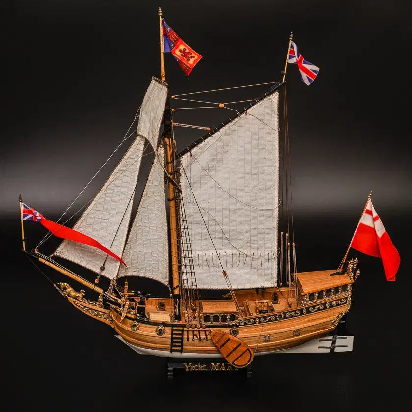 This is a completed 1/54 scale wooden model of the Yacht Mary. The HMY Mary was the first royal yacht of the British Navy, originally built by the Dutch East India Company in 1660. It was later gifted to Charles II after the Restoration. The ship met its fate on March 25, 1675, when it struck a reef off the coast of Anglesey in dense fog. While 35 of the 74 crew and passengers perished, 39 were rescued. Wreckage, including bronze cannons, was recovered in 1971. The remaining artifacts were moved to the Merseyside Museum for preservation and display. The shipwreck site was designated a protected wreck site on January 20, 1974.