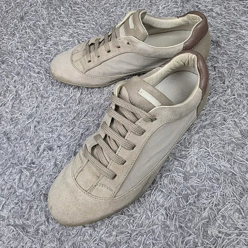 전체적으로 베이지 색상이며, 스웨이드와 패브릭 소재가 혼합되어 있습니다