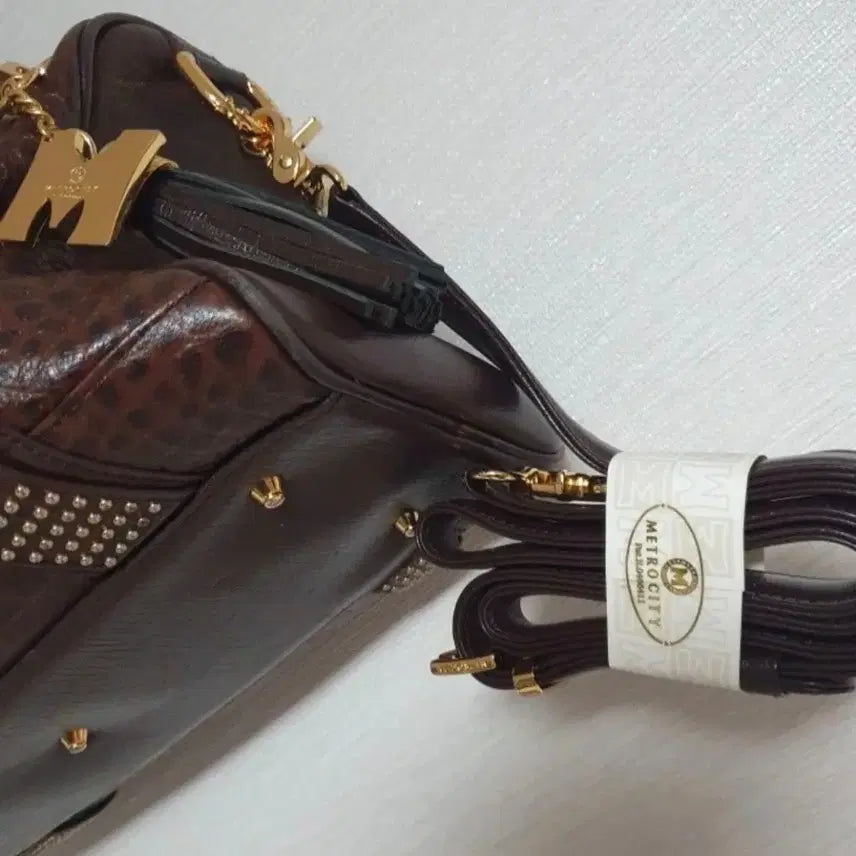 메트로시티 악어 패턴 토트백입니다. 다크 브라운 색상에 금색 스터드 장식이 더해져 고급스러운 느낌을 줍니다. 가방 내부는 메트로시티 로고 패턴으로 되어있고, 바닥면에는 금색 징이 있어 오염을 방지해줍니다. 사용감이 적고 전체적으로 깨끗한 상태이며, 새것 같은 크로스 스트랩도 함께 드립니다. 토트백으로도, 크로스백으로도 활용하기 좋습니다.